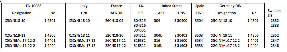 Table 1 - Designation of stainless steels adopted in different countries, compared to the European Community Standard EN 10088.