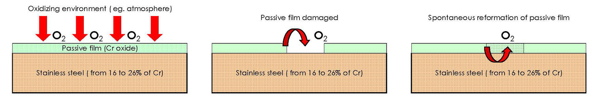 Of course, this passive film can be more or less resistant and more or less anchored to the material depending on the concentration of chromium in the alloy and also the possible presence of other elements such as nickel (Ni), molybdenum (Mo), titanium (Ti), etc.