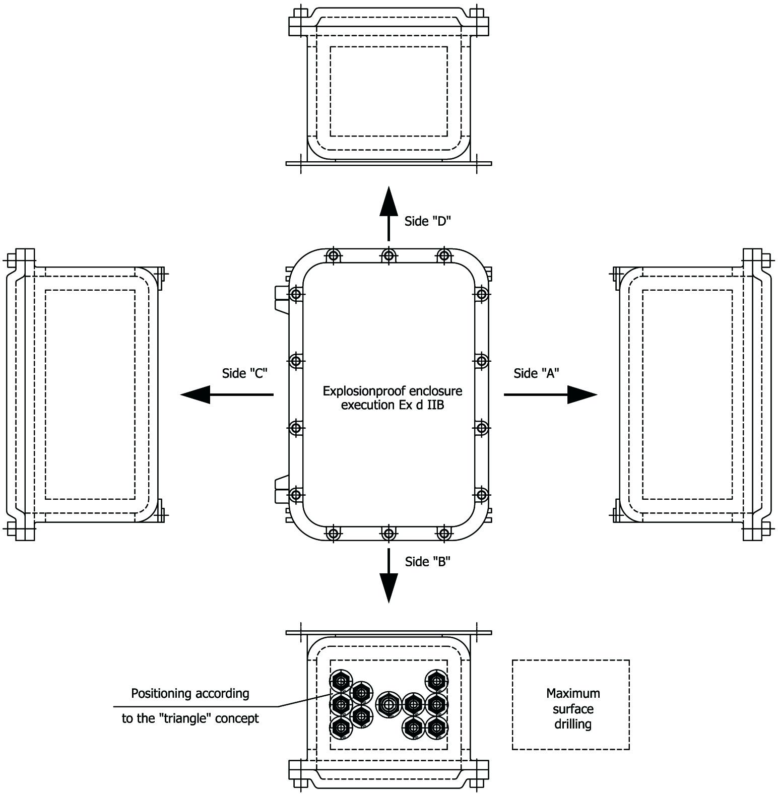 The minimum distance of entries positioning is another parameter that should be carefully analyzed. Indeed, this minimum distance, defined by certificate parameters, in addition to ensuring the mechanical strength of the perforated wall, allows the installer to proceed with the proper tightening of the components into such entries (e.g., cable glands, plugs, reducers and/or adapters). Furthermore, the minimum distance to the boundaries of the maximum drilling is important to ensure non-interference with the thickness of the adjacent wall.
