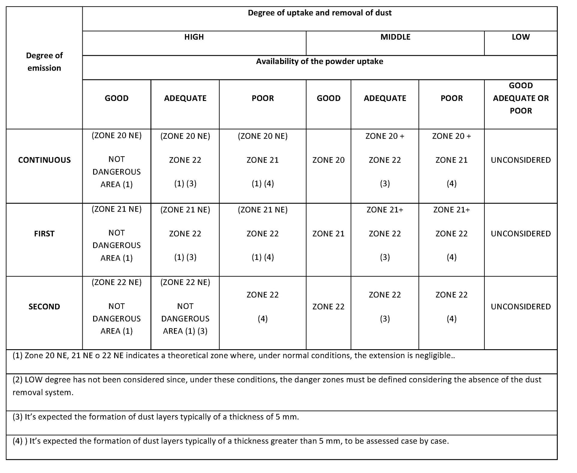 The following table (Guide of Italian CEI 31-56, table GC. 3.2-A) shows a system for determining the danger zones, depending on the characteristics of the extraction system and the degree of emission of the emission source.