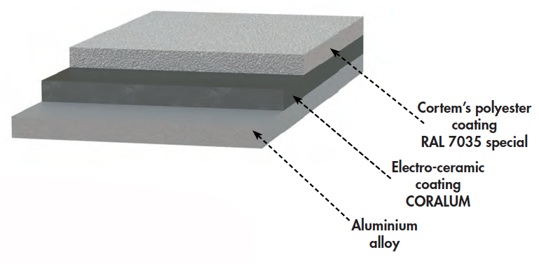 Above CORALUM is then applied the Cortem’s thermosetting powder coating based on crosslinked polyester resins RAL 7035 gray special, pigmented with stainless steel powders to give a greater resistance to impact and an orange peel finish.