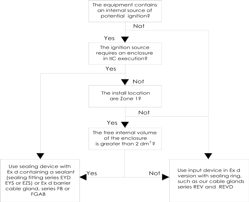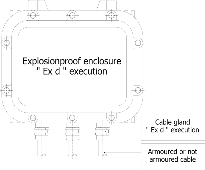 The "directly" execution provides for the entry of cables directly to the Panel Board in ‘Ex d’ execution, with the use of sealed cable glands that does not allow for a possible explosion within the Panel Board to spread outside of it. In this case, the choice of the cable or sealing fitting shall meet the requirements of the Standard, as in Figure 1.