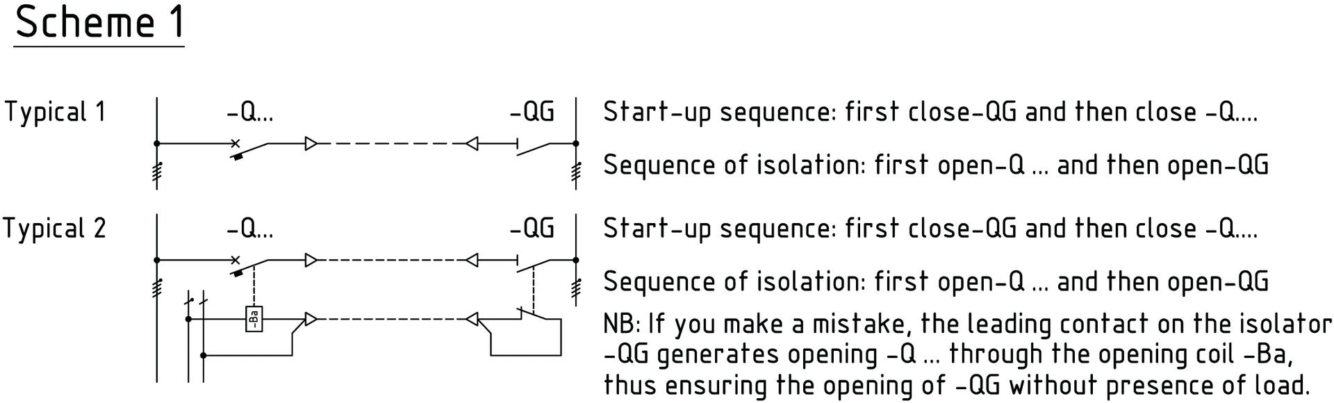 However, it’s possible that the downstream circuit breaker opens without load (Typical 2 in Scheme 1), if the sectioning device is paired with an advanced auxiliary contact on the opening handle. Such contact must be returned to the circuit breaker located upstream of the feeding line, operating on the opening coil of such switch, in order to open it in advance to the downstream isolator, by cutting off the power. In this case, there will be in addition, compared to other solutions described below: a cable, the opening coil and the advanced auxiliary contact.