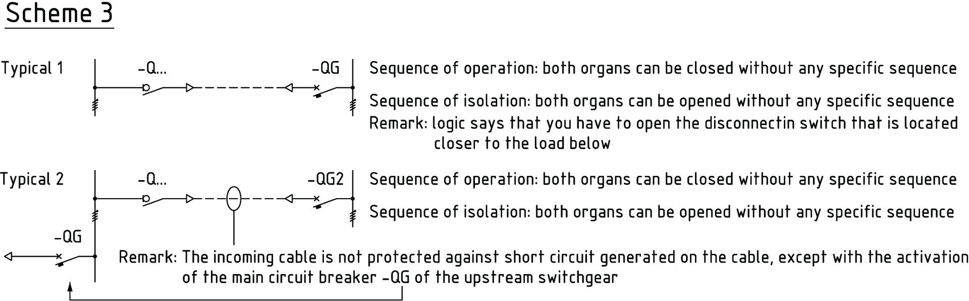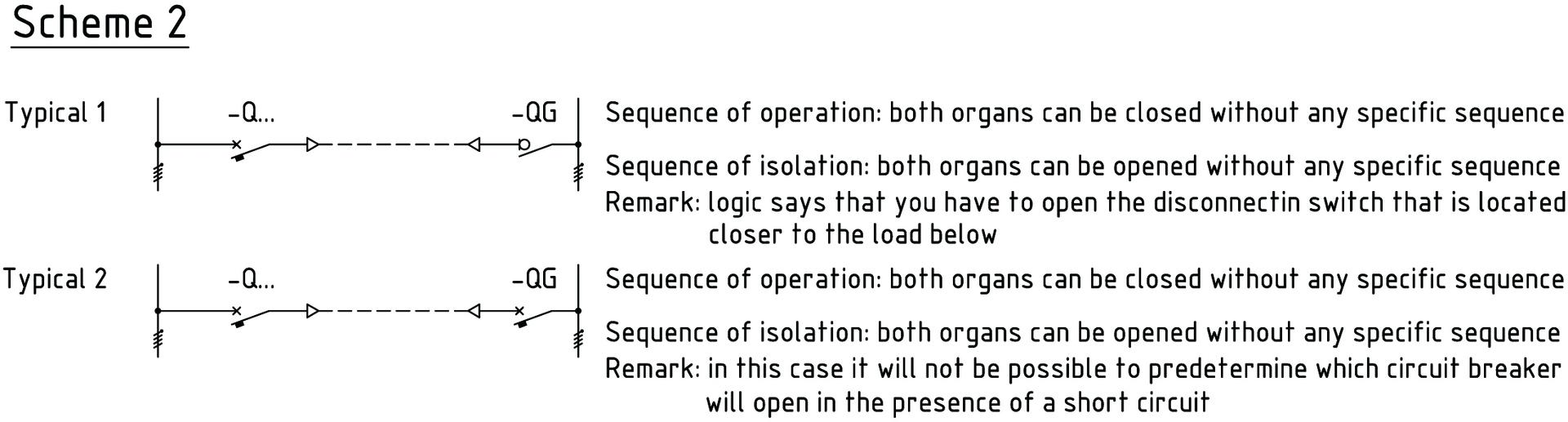 These devices are suitable for the sectioning of the power line and can operate in the presence of voltage but without downstream load (defined as sectioning device -time dependent). They cannot open or close in the presence of a short circuit and they do not have a thermal resistance. The No load switch, as an incoming isolating function to the Panel board, it’s unwise, because unable to open with loads (Typical 1 in Scheme 1).