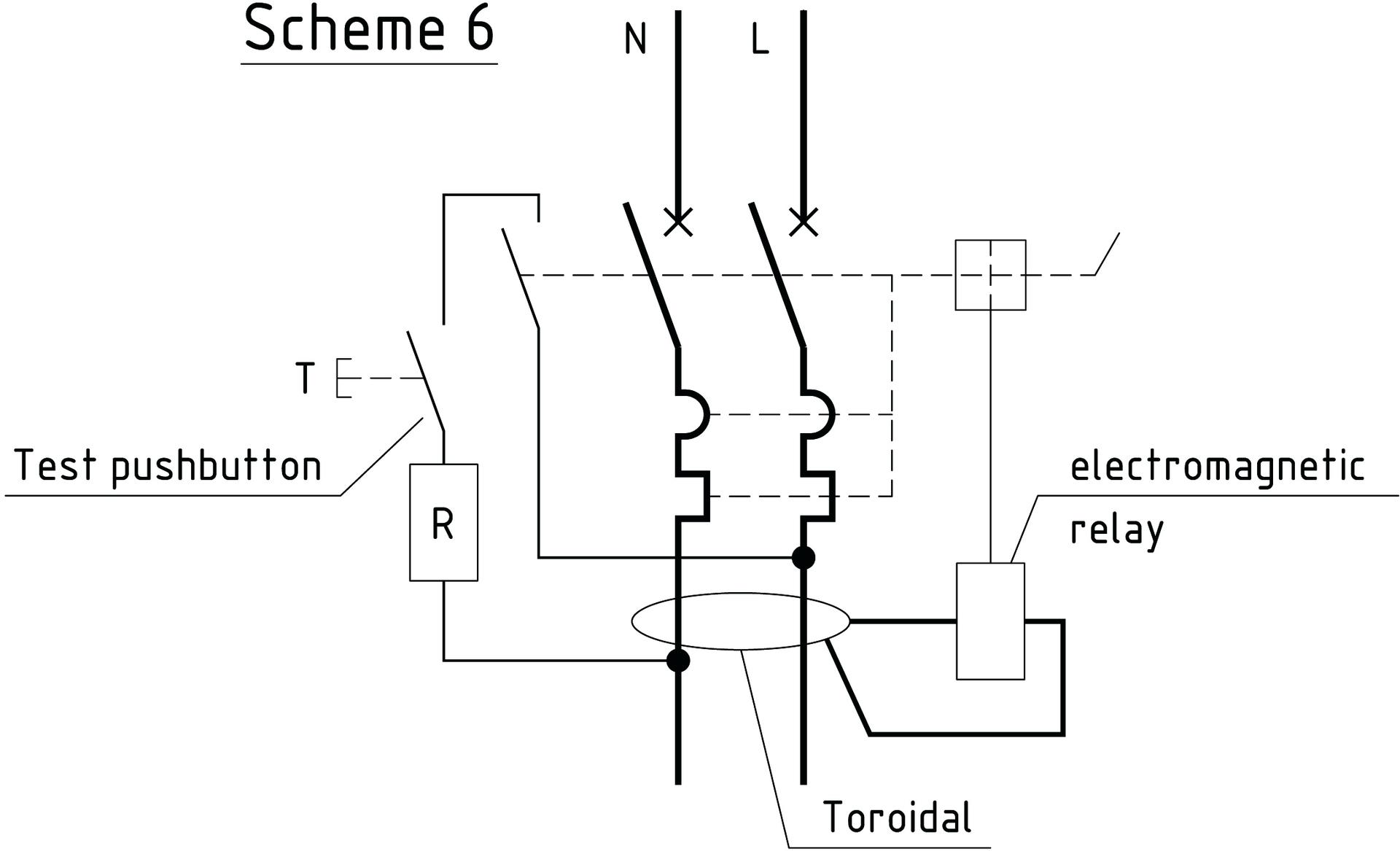 - detection of leakage current, obtained by a toroidal current transformer (Scheme 6) in which the primary is represented by the conductors of the circuit to be protected. Under normal conditions, the vector sum of the currents passing through the conductors is zero, therefore the cash flows generated inside the toroid annul each other. The occurrence of a leakage current breaks this balance and induces a residual current in the secondary.