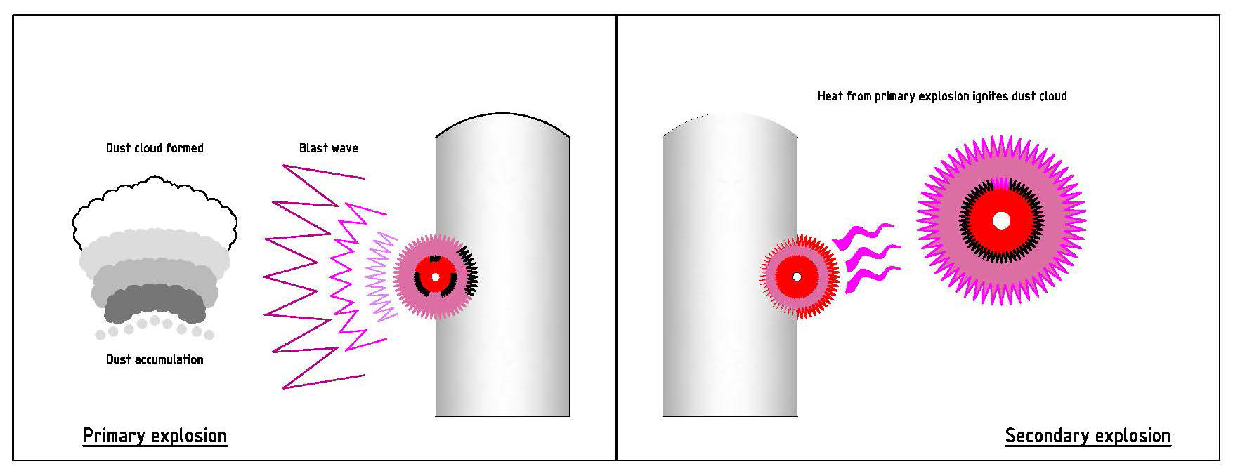 An initial (primary) explosion (Figure 2) in processing equipment or in areas where latent dust has accumulated may dislodge additional dust or damage a collection system (such as a duct, vessel or collector). This dust, if ignited, causes additional explosions (secondary explosion) which can cause damages more severe than the original explosion due to increased concentrations and quantities of dispersed combustible dust.