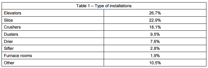 Table 1 shows, for 400 explosions recorded, the types of plants affected in the food industry and fodder for cattle industry.