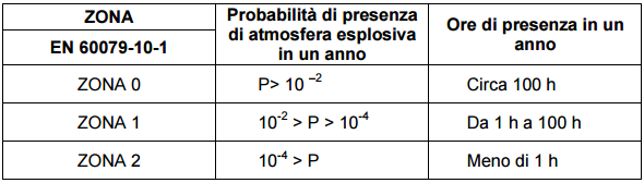 Nel mondo vengono seguite le raccomandazioni IEC 60079-10-1, oggi recepite e divenute norma europea EN 60079-10-1. Tale norma riguarda le classi di sostanze appartenenti ai gas, vapori e nebbie. La norma EN 60079-10-2 riguarda invece la classificazione delle aree pericolose per la presenza di polveri combustibili. La EN 60079-10-1 si applica a tutti quei luoghi in cui sono presenti sostanze che sotto forma di vapore o di gas possono determinare con l’aria miscele esplosive. Principalmente si tratta di impianti chimici o petrolchimici, depositi di gas, stazioni di decompressione del metano, cabine di verniciatura, depositi di carburante, e tutti quegli ambienti, che sono la maggior parte degli ambienti a rischio di esplosione, ove vi sia la presenza di sostanze che possono creare miscele esplosive, sia sotto forma di gas che di vapori o nebbie. Per valutare il pericolo e, quindi, la classificazione dell’area, questa norma si basa su valutazioni analitiche che considerano alcuni principi come la reale ventilazione dell’ambiente, le concentrazioni delle miscele potenzialmente esplosive, i tempi di permanenza delle miscele calcolate in rapporto al LEL e alla ventilazione del luogo considerato. Alla fine di questa analisi ogni luogo pericoloso deve essere classificato in una delle seguenti tre zone in base alla frequenza di formazione e alla permanenza di un’atmosfera esplosiva: