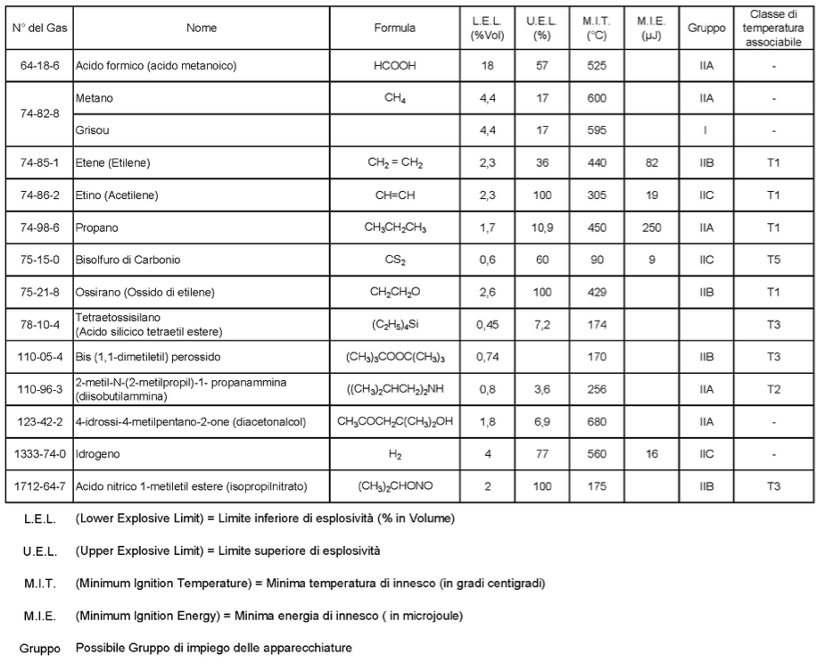 Vediamo nella Tabella 1 che, a seconda del tipo di gas, si ha una minima temperatura di innesco specifica, alla quale si può o meno associare una esecuzione e una classe di temperatura.