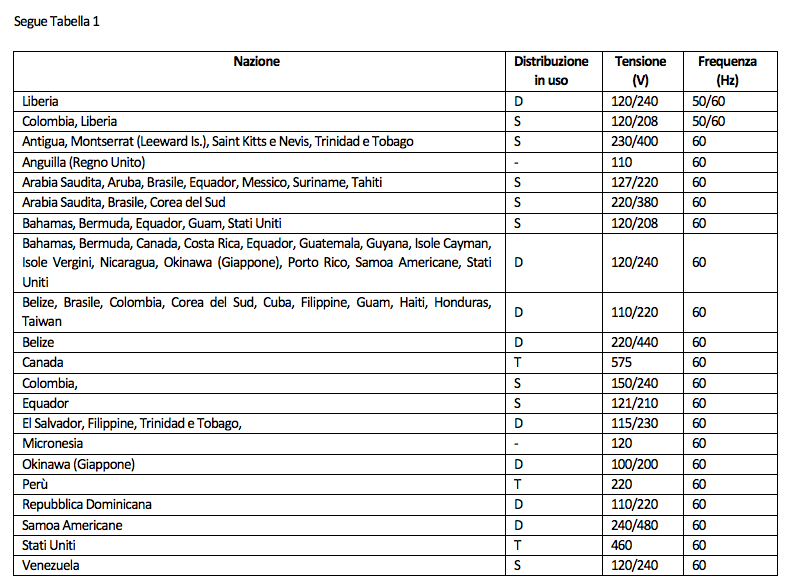 Come si potrà notare dalla tabella 1 sotto riportata, tante sono le variabili di livelli di tensione a livello mondiale, variabili che si sono via via sviluppate in base a criteri che non hanno una vera logica, ma solo una caratteristica specifica dettata dalle leggi locali e dall’appartenenza o meno della nazione a pregressi di colonialismo o sudditanza da altre nazioni colonizzatrici. Scarsa o nulla è la standardizzazione mondiale per cause che risalgono alle posizioni protezionistiche di molti produttori nazionali difesi in senso monopolistico dai rispettivi governi.