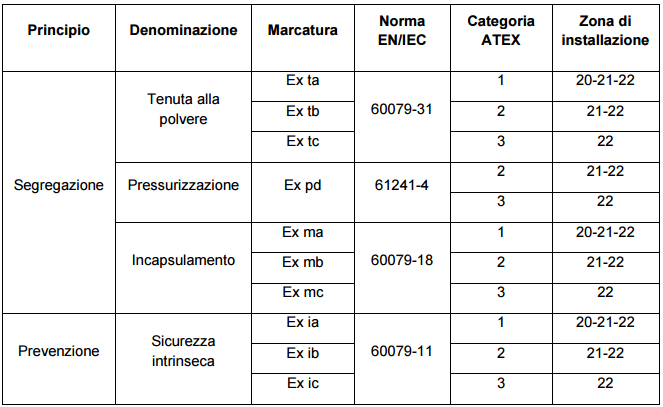 Un tempo non esisteva una vera e propria divisione dei modi di protezione per i Gas e per le Polveri. Il pericolo di esplosione causato dalle nubi di polveri era sottostimato rispetto a quello dei Gas, vapori e nebbie. Pertanto, erano impiegati gli stessi modi di protezione per i Gas. Oggi, con l’evoluzione normativa, si è arrivati, invece, a una definizione di apparecchiature che sono studiate appositamente per gli ambienti con pericolo di esplosione per la presenza di polveri. Mentre per i gas vale il principio che è in pratica impossibile impedirne la penetrazione all’interno della custodia, al contrario, per le polveri, la protezione si basa sul principio di impedire alle polveri di penetrare nelle custodie nelle quali vi sono le apparecchiature che potrebbero scintillare.