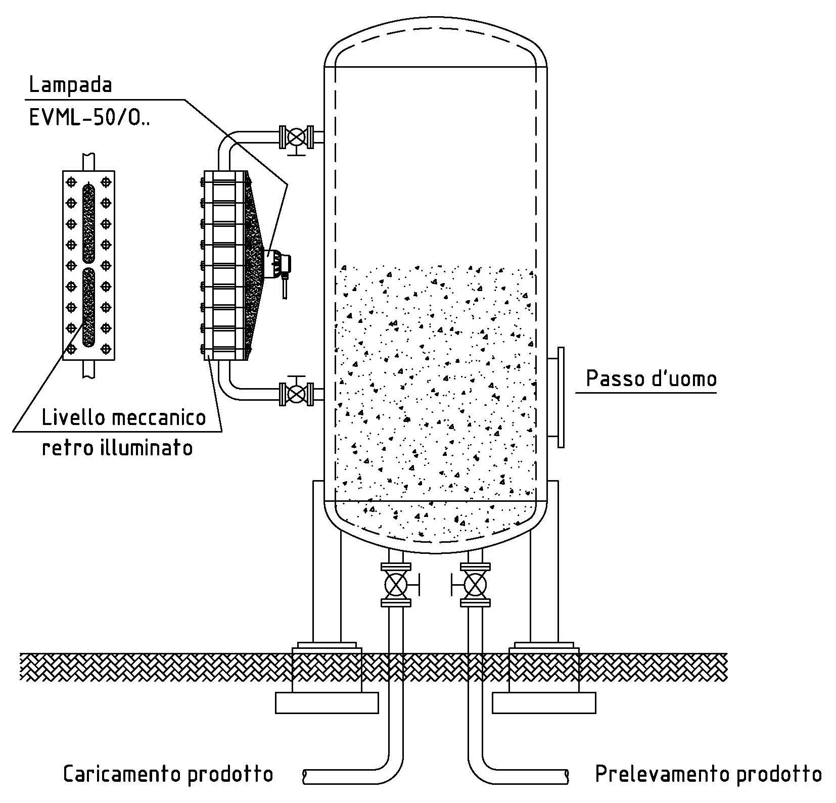 Fig. 2 Applicazione di corpo illuminante serie EVML-50/O.. per serbatoi con livello retro illuminato
