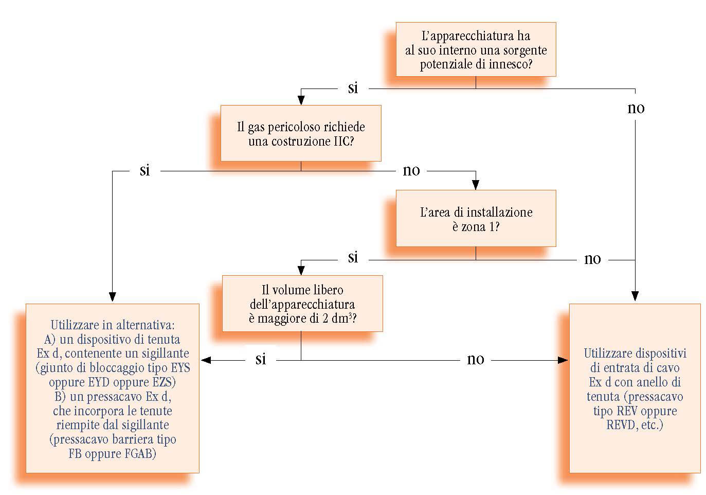 I pressacavi con anelli di tenuta non possono essere utilizzati in determinate condizioni. Nello schema qui sotto, introdotto dalla norma EN 60079-14, è riportato il diagramma di flusso per la corretta scelta del pressacavo.
