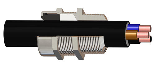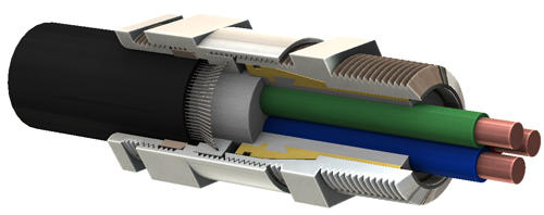 I pressacavi per cavi armati hanno due guarnizioni, la prima, anteriore è quella che fa tenuta sul diametro interno del cavo e garantisce la protezione antideflagrante, la seconda, posteriore, fa tenuta sulla guaina esterna del cavo e protegge dalla penetrazione di liquidi all’interno del pressacavo, dove è bloccata l’armatura da due anelli conici che garantiscono la continuità elettrica della messa a terra.