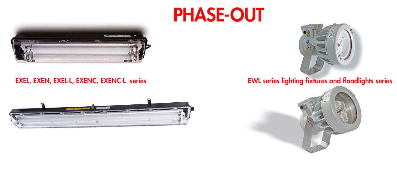 Le armature illuminanti lineari in plastica serie EXEL, EXEN, EXEL-L, EXENC, EXENC-L possono essere sostituite con le armature illuminanti LifEx-P mentre, le armature illuminanti e i proiettori serie EWL, possono essere sostituiti con le armature illuminanti a LED High Bay serie Flowex e dai proiettori serie EVL.
